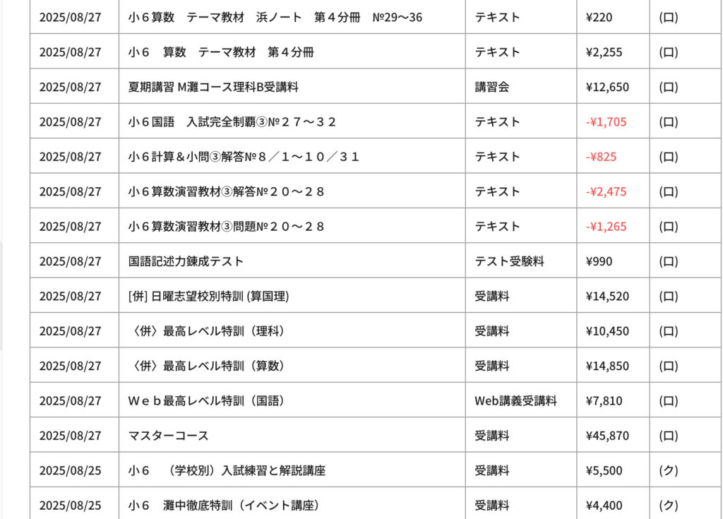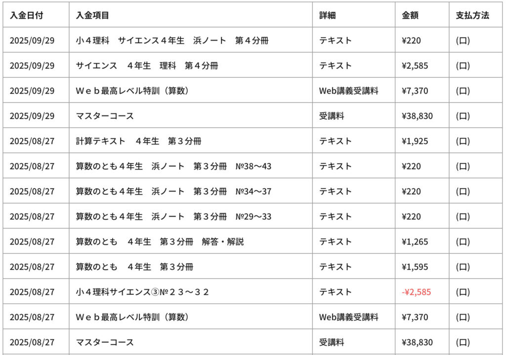 ちなみに、マイナスされているところは、長男のお下がりを利用できるテキストがあったので教材を返却したからです。