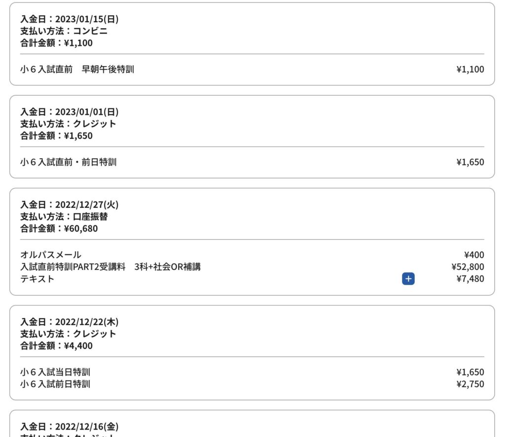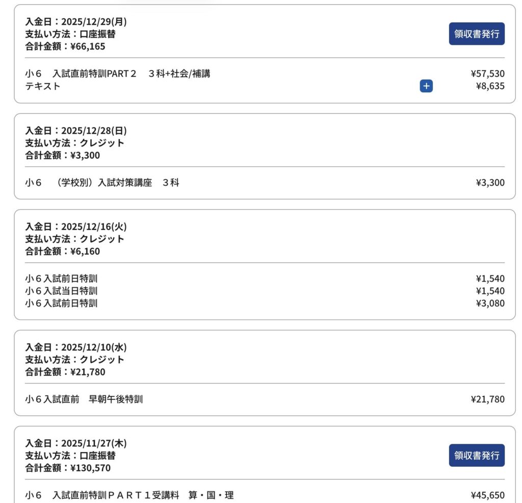 浜学園のマイページでは、4月現在、成績は見られなくなってはいるものの、なんと投じてきた教育費用だけはまだ閲覧可能です。