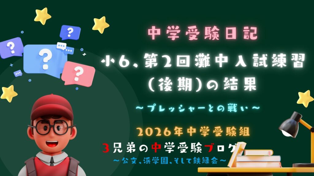 10月の公開模試の翌日に「第2回灘中入試練習」がありました。 前期(2〜8月)に2回ほど入試練習があるので、灘中入試練習は今回で通算4回目と言うことになります。 次男は、ギリギリ合格も含めてここまでの灘中入試練習は全て合格判定を得ています。 8月の... -